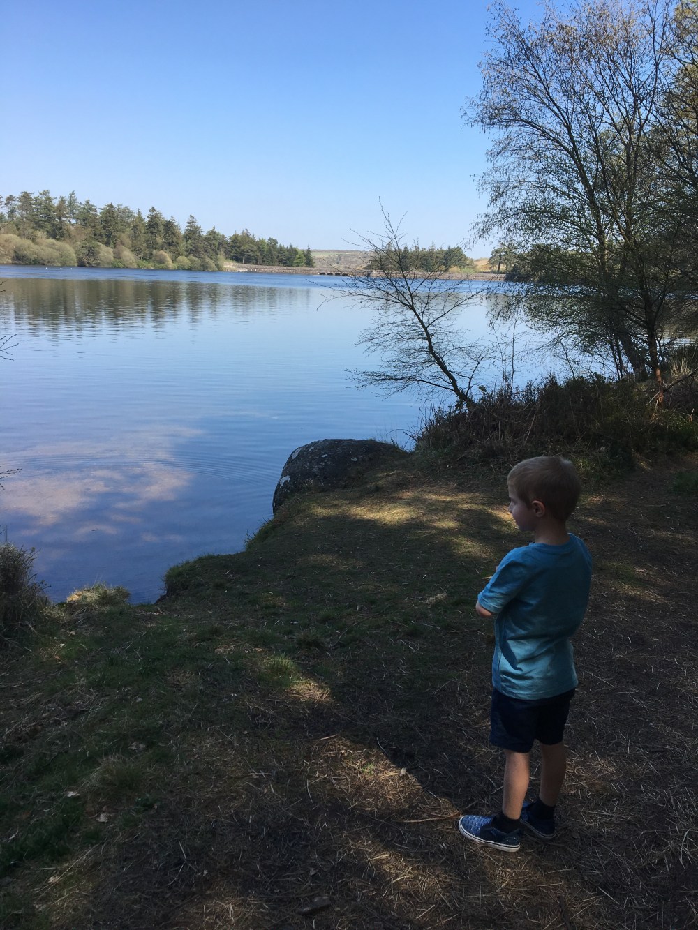 My husband suggested that we visit Venford Reservoir as neither of us had been there before. There are two free car parks on either side of the reservoir and a path that runs all the way round the reservoir. The path is uneven with gravel and tree roots so be careful where you are reading. Obviously we were both on high alert that Edward would fall in because he has absolutely no fear.